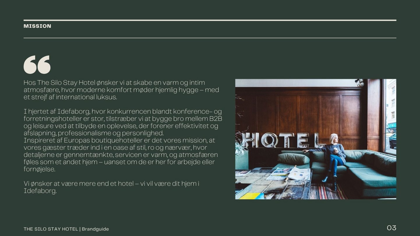 I får en samlet guide på 5 sider, der dokumenterer jeres mission, visuelle stil, farver, fonte, keywords og logobrug – samt eksempler på kreative elementer.