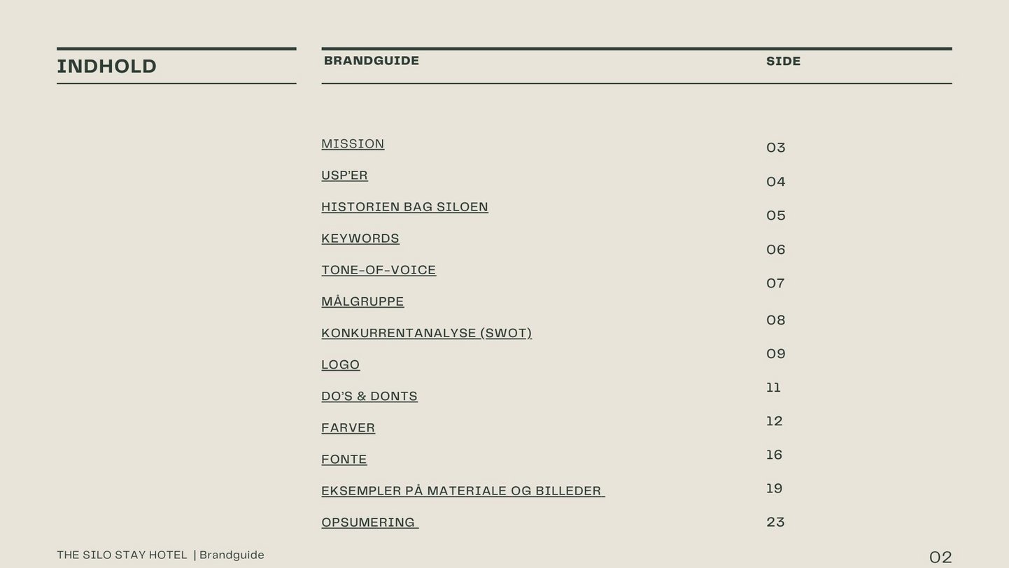 I får en udførlig 20-siders guide, der dokumenterer jeres brand fra A til Z – inkl. mission, tone-of-voice, målgrupper, konkurrentanalyse, visuel identitet og konkrete eksempler på brug.